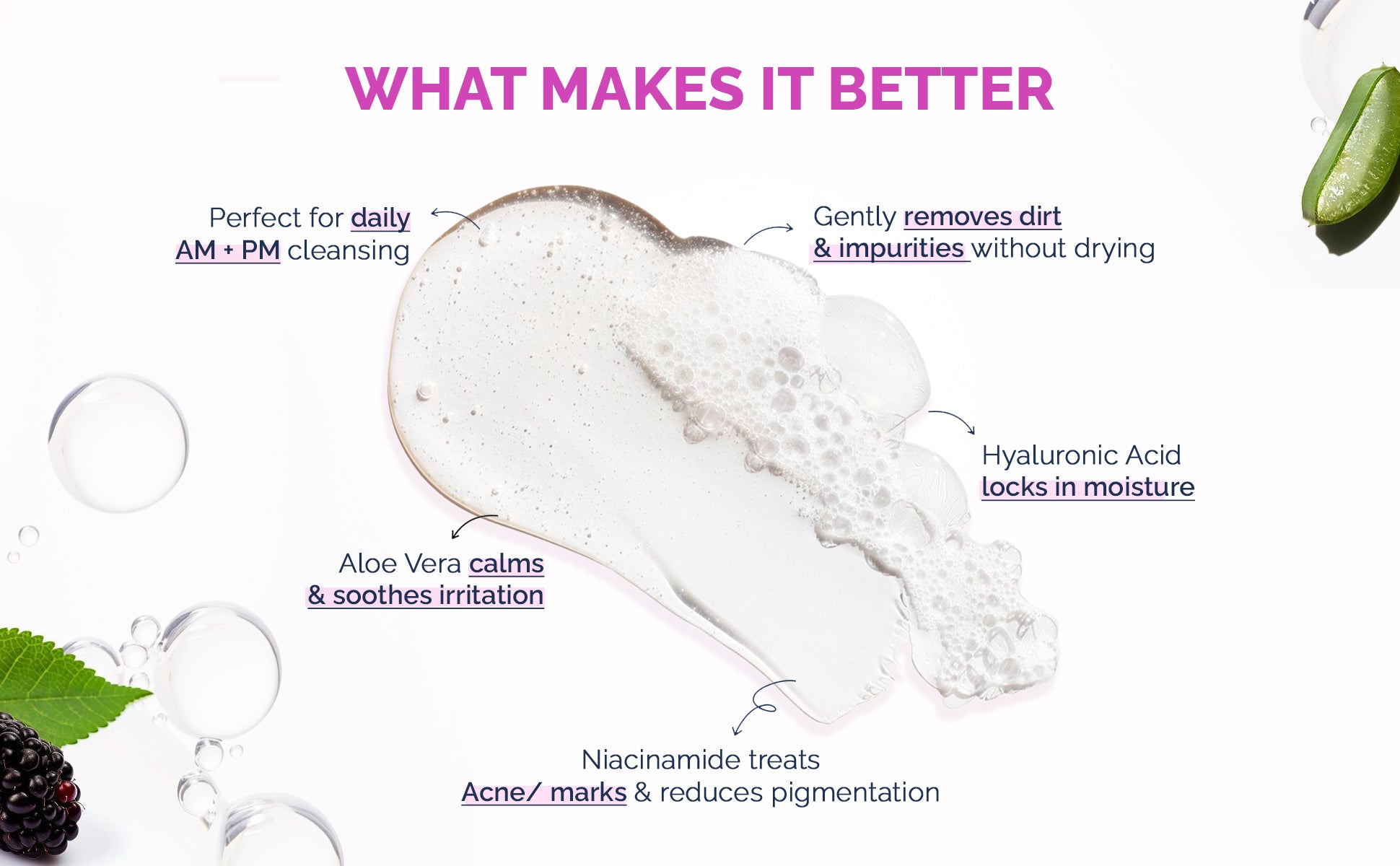 Gentle, gel-based facewash powered by mulberry, hyaluronic acid, and niacinamide. Hydrates, soothes, and revives dull, tired skin - without stripping it dry.